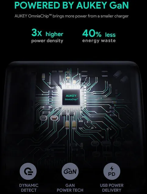 Адаптер питания Aukey Omnia Duo 65Вт 2xUSB Type-C Black PA-B4 — компактное и высокопроизводительное устройство для зарядки ваших гаджетов. Оснащенный технологией GaN (Gallium Nitride) и поддержкой Power Delivery, адаптер обеспечивает мощность до 65 Вт, что позволяет эффективно заряжать смартфоны, планшеты, ноутбуки и другие устройства.