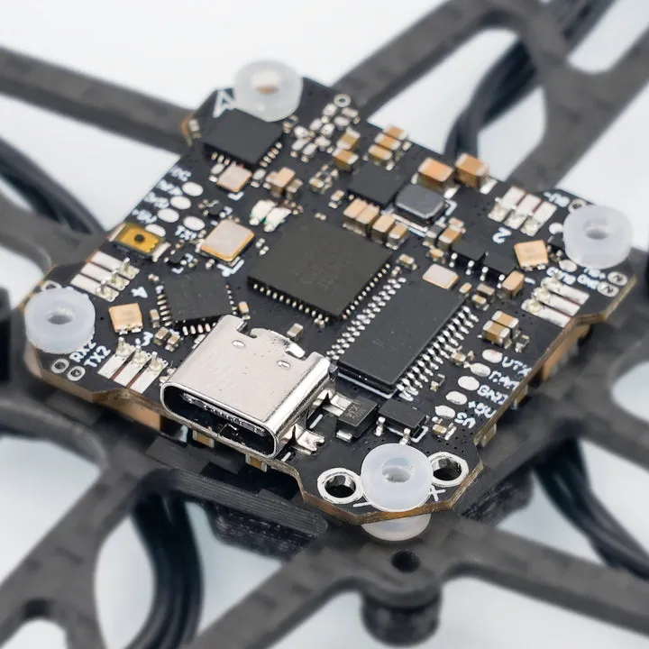 В устройство встроен собственный измеритель тока, есть два светодиода, которые можно программировать. Кроме того, конструкция контроллера включает в себя приемник SPI Frsky. К контроллеру можно подключить аккумуляторы 1S. Модель может быть установлена на раму увеличенного размера в 85 мм, что делает модель еще более выдающейся. Подключение двигателей дрона организовано с помощью 8 разъемов PH-1.25.