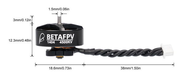 Бесщеточный двигатель BetaFPV 1404-4500KV изготавливается в небольшом корпусе из прочного и долговечного алюминиевого сплава, окрашенного в черный цвет. Содержит монтажные отверстия для 4 винтов типа М2. Поддерживает работу с аккумуляторной батареей 4S 75C Lipo с емкостью 450 мА/ч. Имеется качественный кабель 28AWG, снабженный коннектором Micro JST-1.25. Комплектуется дополнительными моторными клипсами. Диаметр вала составляет 1.5 мм, а длина – 3 мм.