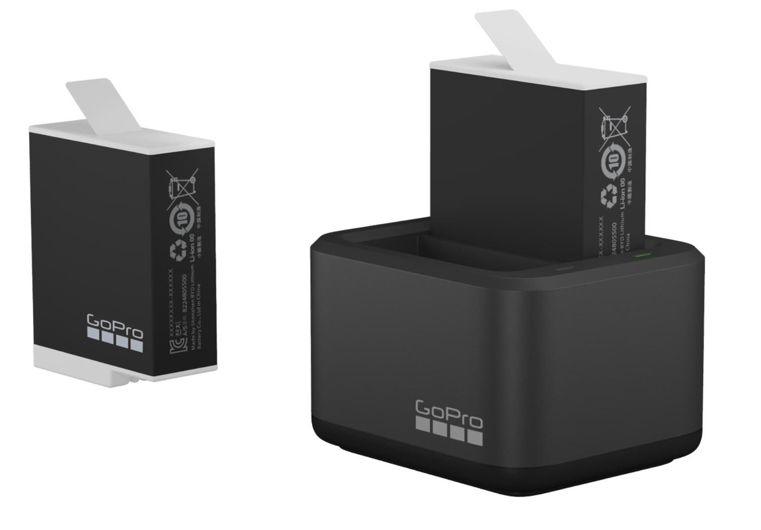 Двойное зарядное устройство + аккумулятор GoPro Enduro изготавливаются с простым и лаконичным дизайном. Имеют долговечные корпусы из полимерного пластика. Окрашены в черный матовый цвет. Для подключения к источнику электропитания предусмотрен распространенный интерфейс USB. Позволяет одновременно заряжать два аккумулятора. Полностью совместим с сериями устройств GoPro HERO9, HERO10 и HERO11.