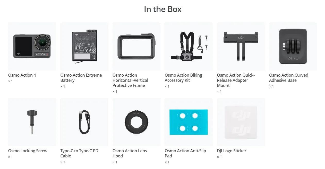 | Комплектация | Экшн-камера DJI Osmo Action 4 Fishing Combo: / Аккумулятор Osmo Action Extreme × 1 / Защитная рамка × 1 / Комплект Osmo Action Biking Accessory Kit × 1 / Адаптер Osmo Action Quick-Release × 1 / Изогнутая клейкая основа Osmo Action × 1 / Стопорный винт × 1 / Кабель Type-C на Type-C PD × 1 / Бленда Osmo Action × 1 / Противоскользящая накладка Osmo Action × 1 / Наклейка с логотипом DJI × 1 / Руководство |