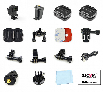 | Комплектация | Экшн-камера SJCAM M20 / водонепроницаемый бокс / крышка бокса с отверстиями под звук для записи на суше / крепление для велосипеда / базовое крепление 1 / базовое крепление 2 / крепление-адаптер / клипса на пояс / крепление на штатив / переходные звенья / база на шлем / ремень / хомут / ЗМ-клейкая лента / страховочный тросик / салфетка для оптики / USB-кабель |