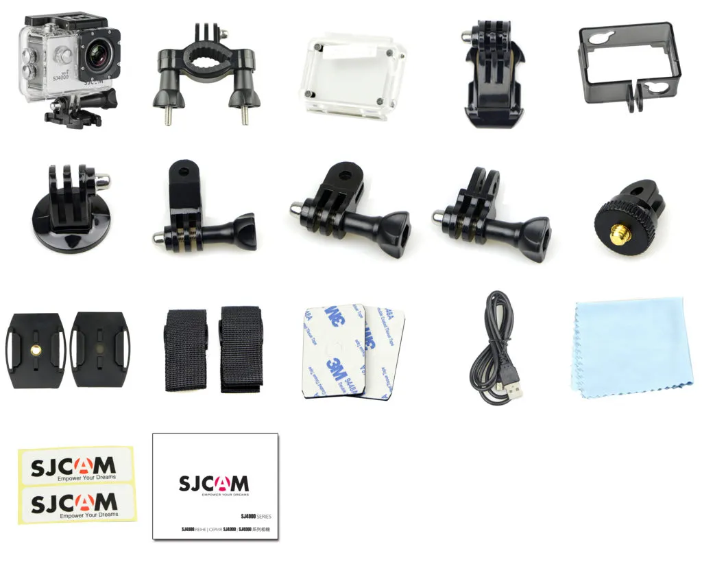 | Комплектация | Экшн-камера SJCAM SJ4000WIFI / 1 x Водонепроницаемый бокс / 1 x Быстрорегулирующаяся защелка / 1 x Задняя крышка с отверстиями / 1 x Крепление на трубу / 1 x Гибкое клейкое крепление / 1 x Плоское клейкое крепление / 1 x Монопод-штатив “3-Way” / 2 x Клейкая лента 3M / 1 x Рамочное крепление / 1 x Быстрорегулирующаяся клипса для рамки / 1 x Вертикальная защелка J-Hook / 1 x Универсальный 1/4 трипод для камеры / 1 x Адаптер трипод / 1 x Ремни / 1 x Защитный металлический зажим из нержавеющей стали / 4 x Нейлоновые кабельные стяжки / 1 x Ткань протирочная / 1 x USB кабель / 1 x 900mAh литий-ионный аккумулятор / 1 x Мультиязычное руководство пользователя / 2 x Стикера Sjcam |