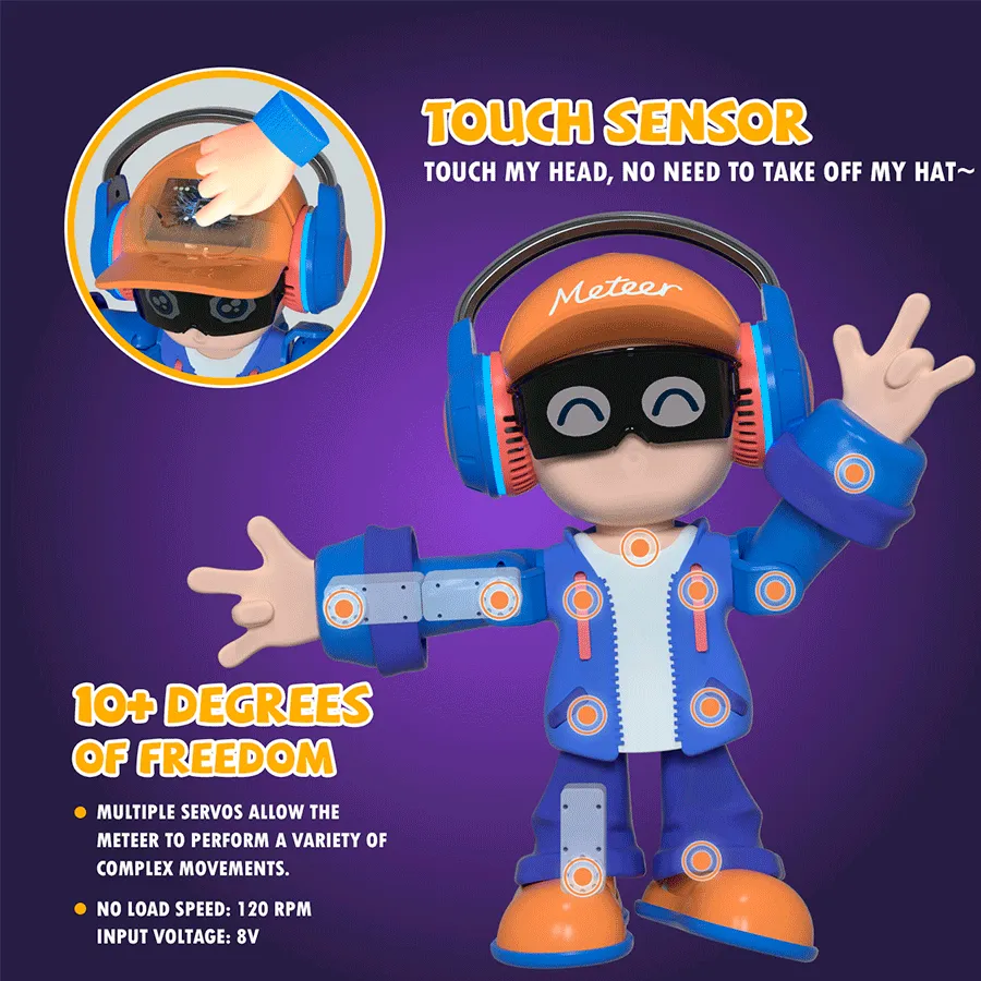 Оснащённый мощными сервомоторами и динамиками, робот-танцор Meteer исполняет целые танцевальные связки, вовлекая ребёнка в интерактивную игру. Его возможности раскрываются ещё ярче, если подключить музыку - движения становятся живыми, а световые и звуковые эффекты превращают выступление в мини-шоу. Управление голосом осуществляется на английском языке, и это не минус, а дополнительная возможность для ребёнка попрактиковаться и выучить простые фразы, играя.
