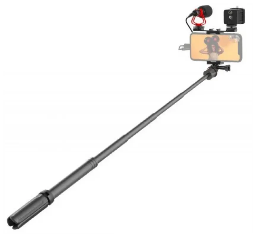 Штатив с тремя опорами поможет снимать статичные видео в формате интервью или монолога. Телескопическая палка увеличивается до 695 мм и позволяет снимать с лучшим обзором, захватывая в кадр больше пространства, объектов и людей. Микрофон подключается к смартфону через разъем 3.5 мм и существенно снижает уровень шума во время съемки.