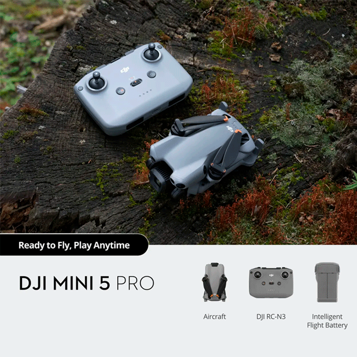 | Комплектация | DJI Mini 5 Pro ×1 / Пульт DJI RC-N3 ×1 / Интеллектуальная батарея ×1 / Чехол ×1 / Кабель RC-N (USB-C и Lightning) ×2 / Кабель USB-C-USB-C ×1 / Запасной пропеллер (пара) ×1 |