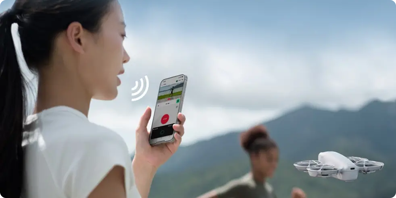 DJI Neo можно подключить к смартфону через Wi-Fi и управлять с помощью приложения DJI Fly, используя виртуальные джойстики для управления дроном и настройки углов съемки. Кроме того, поддерживается голосовое управление, позволяющее отдавать команды без использования рук