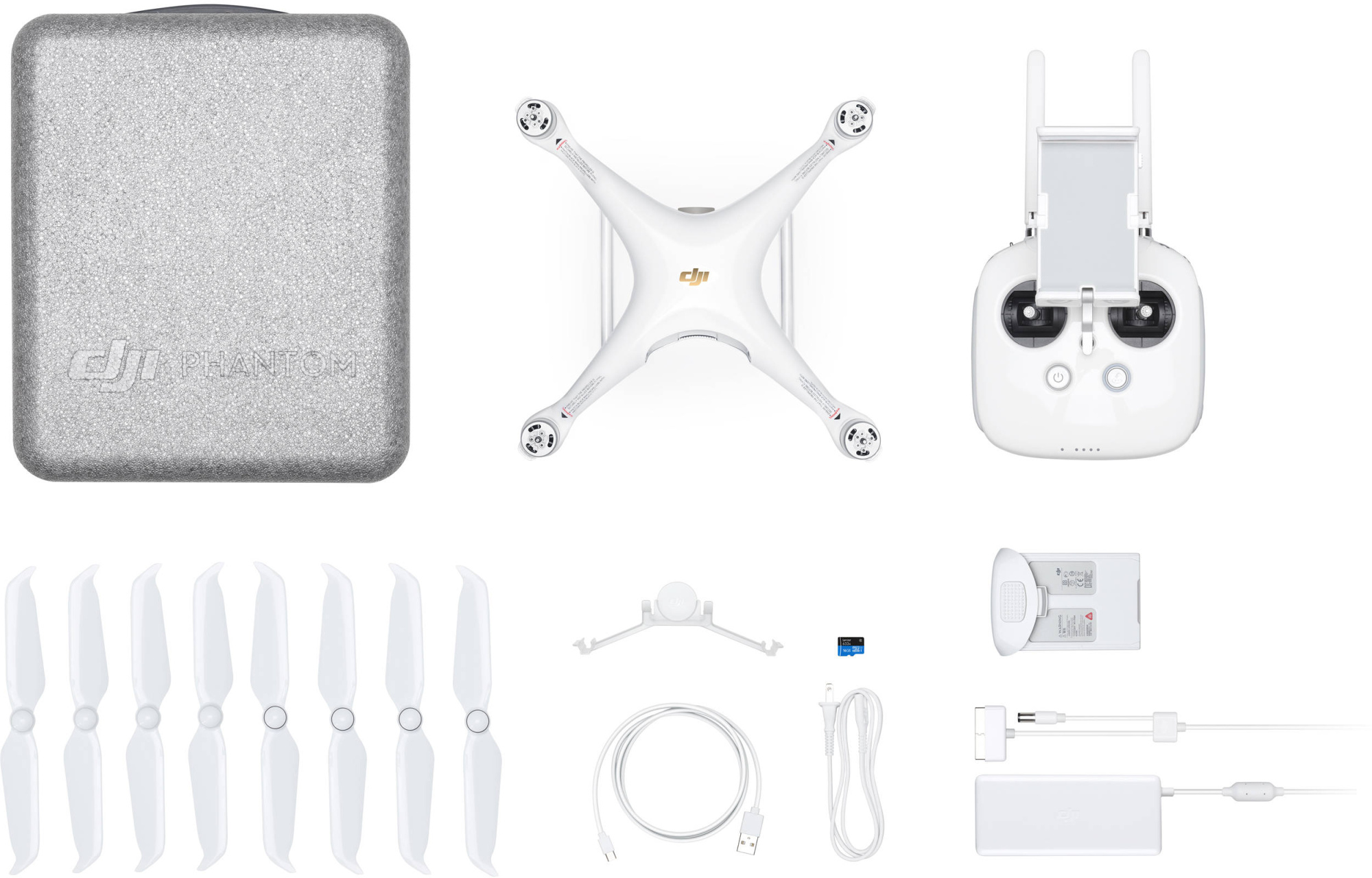 | Комплектация | дрон Phantom 4 Pro V2.0 / пульт управления с креплением для смартфона / 4 пары пропеллеров / 1 батарея / зарядное устройство / кабель / USB OTG кабель / защита кардана / microSD карта / кейс для переноски / документация |