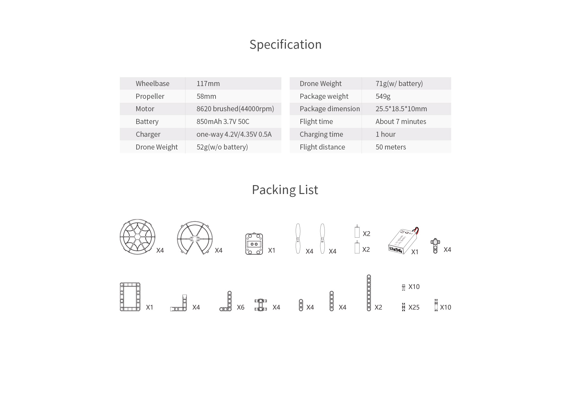 | Комплектация | Квадрокоптер Litebee Brix III STEM / Пульт х 1 / USB-зарядное устройство х 1 / USB-кабель х 1 / Инструмент для пропеллера x 1 / Руководство |