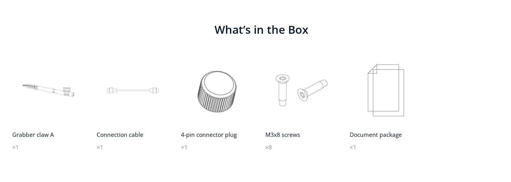 | Комплектация | Манипулятор Chasing Grabber Claw A / Кабель х 1 / Заглушка 4-пинового коннектора х 1 / Винты М3х8 х 8 / Руководство |