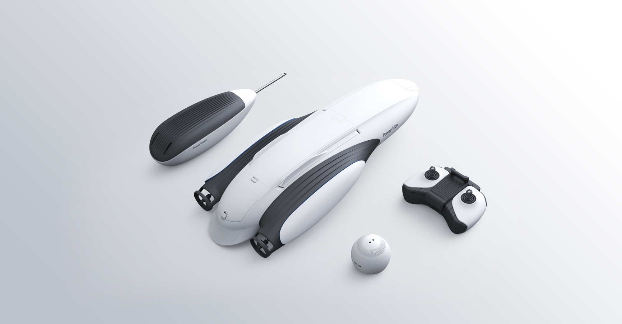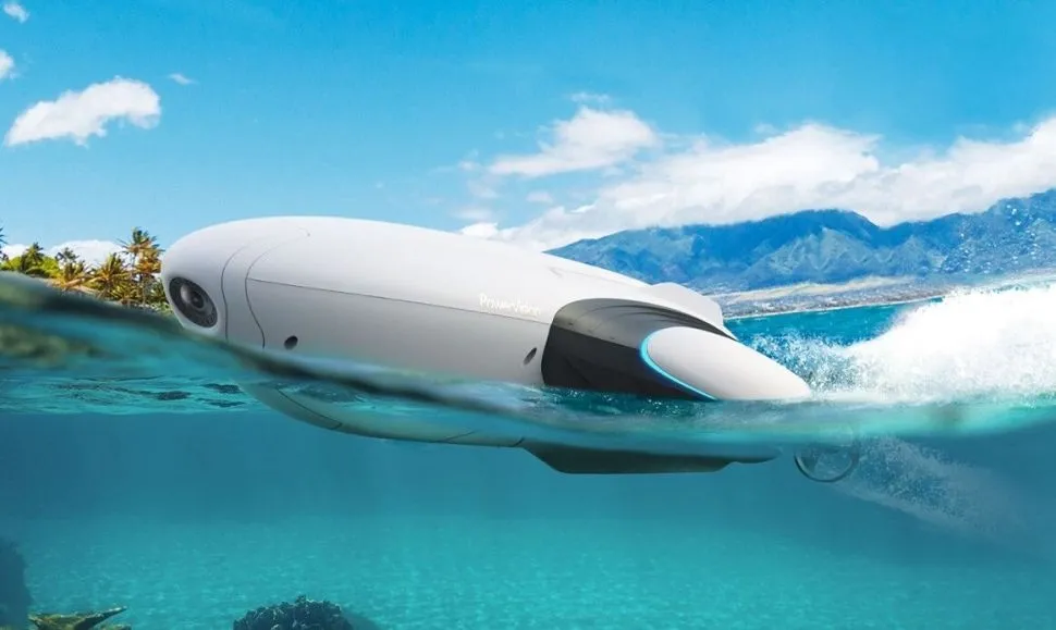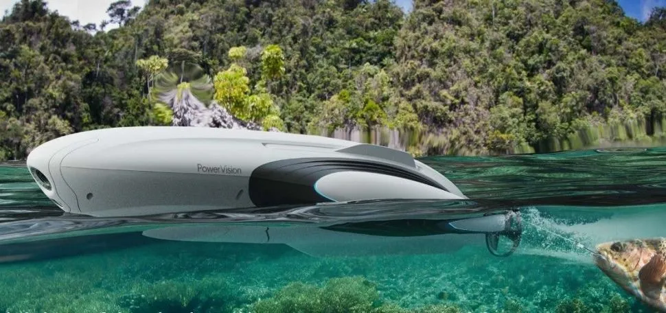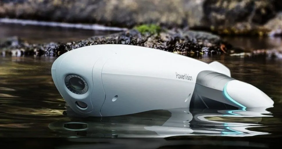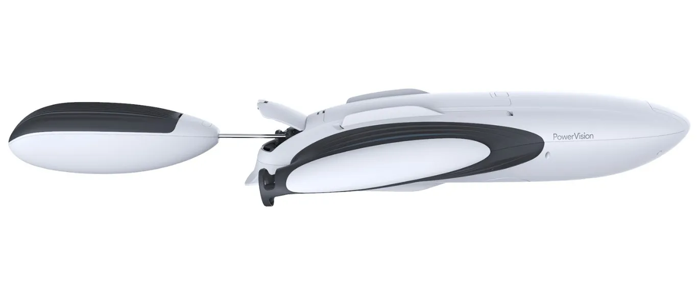 Плавающий дрон PowerVision PowerDolphin в комплектации Wizard для рыбалки, оборудован 4К камерой, эхолотом PowerSeak, пультом дистанционного управления и контейнером для прикормки. Устройство плавает на поверхности воды и может погружаться на глубину до 30 метров, передвигаться на скорости 3-4 морских узла и пребывать в воде до 150 минут.