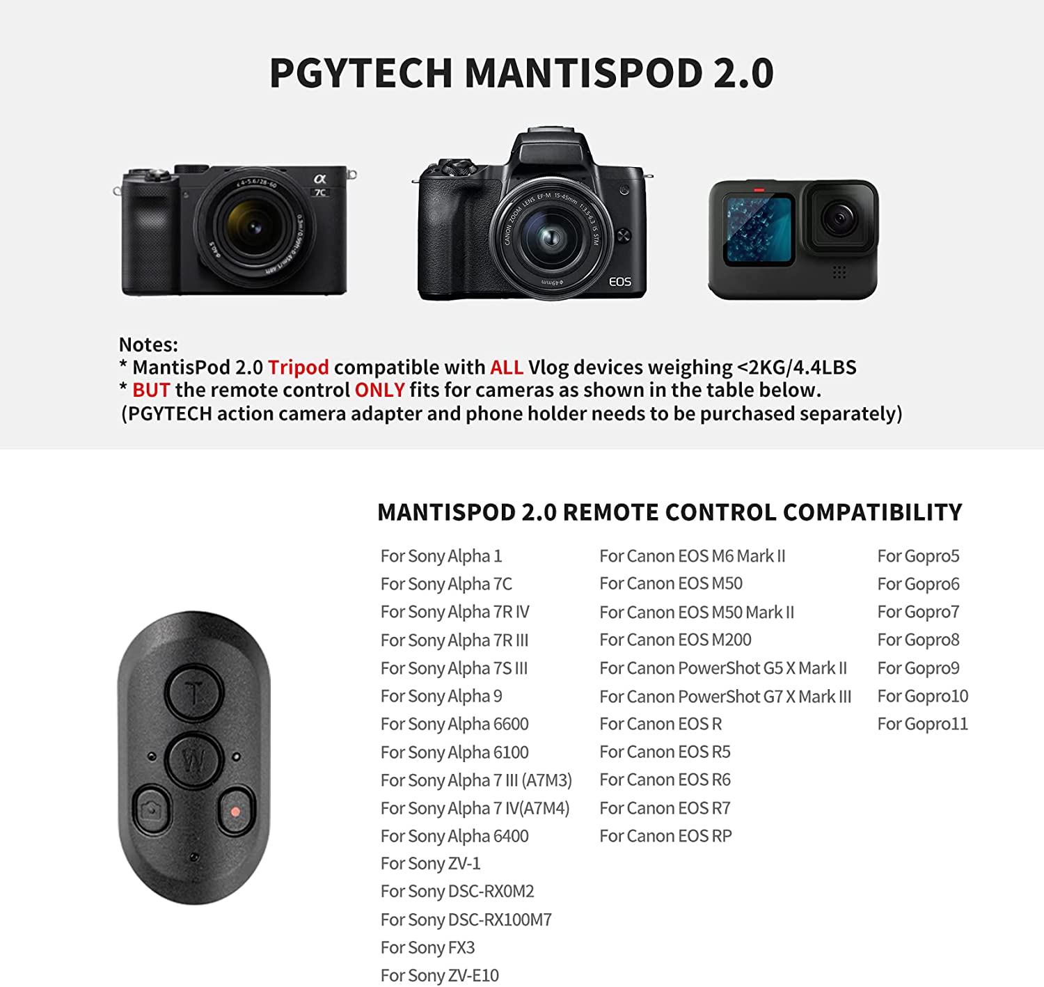 | Дополнительные возможности | Совместим со многими камерами, кроме Nikon и некоторых других марок / Совместим с Gopro 5/6/7/8/9/10 |