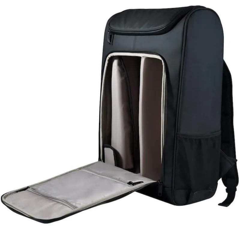 Рюкзак оснащен удобными широкими лямками с возможностью регулировки длины. Лямки дополнены грудной стяжкой, которой можно воспользоваться при долгом ношении дрона в рюкзаке. Спинка рюкзака жесткая, с мягкими вставками с внешней стороны, обеспечивающими более комфортное ношение тяжелой техники.