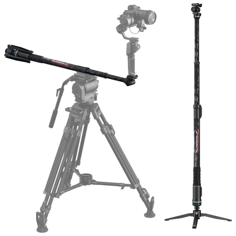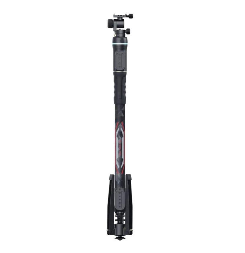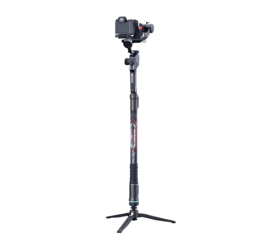 Устройство произведено из легкого, но прочного углеродного материала – карбона. Конструкция устойчива к воздействию воды и песка. Монопод имеет складную конструкцию и оснащен прочным триподом-основанием для самостоятельной установки на любой поверхности. Также монопод можно присоединить к штативу. Вес устройства всего 1460грамм, поэтому его можно брать с собой на любые съемки. В сложенном виде монопод помещается в рюкзак.