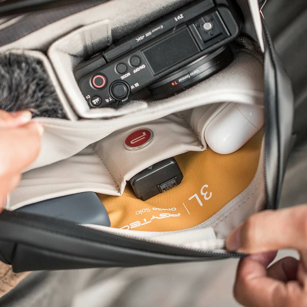 В расширяемой сумке с плечевым ремнём предусмотрены 3 специальных кармана для аккумуляторов камеры с индикатором уровня заряда. Рюкзак включает модульные элементы в виде различных складных перегородок для обеспечения широких возможностей персонализации размещения аксессуаров. Спинка рюкзака выполнена из мягкой подушки с сетчатой конструкцией и воздушными каналами для циркуляции воздуха, что обеспечивает дополнительный комфорт.